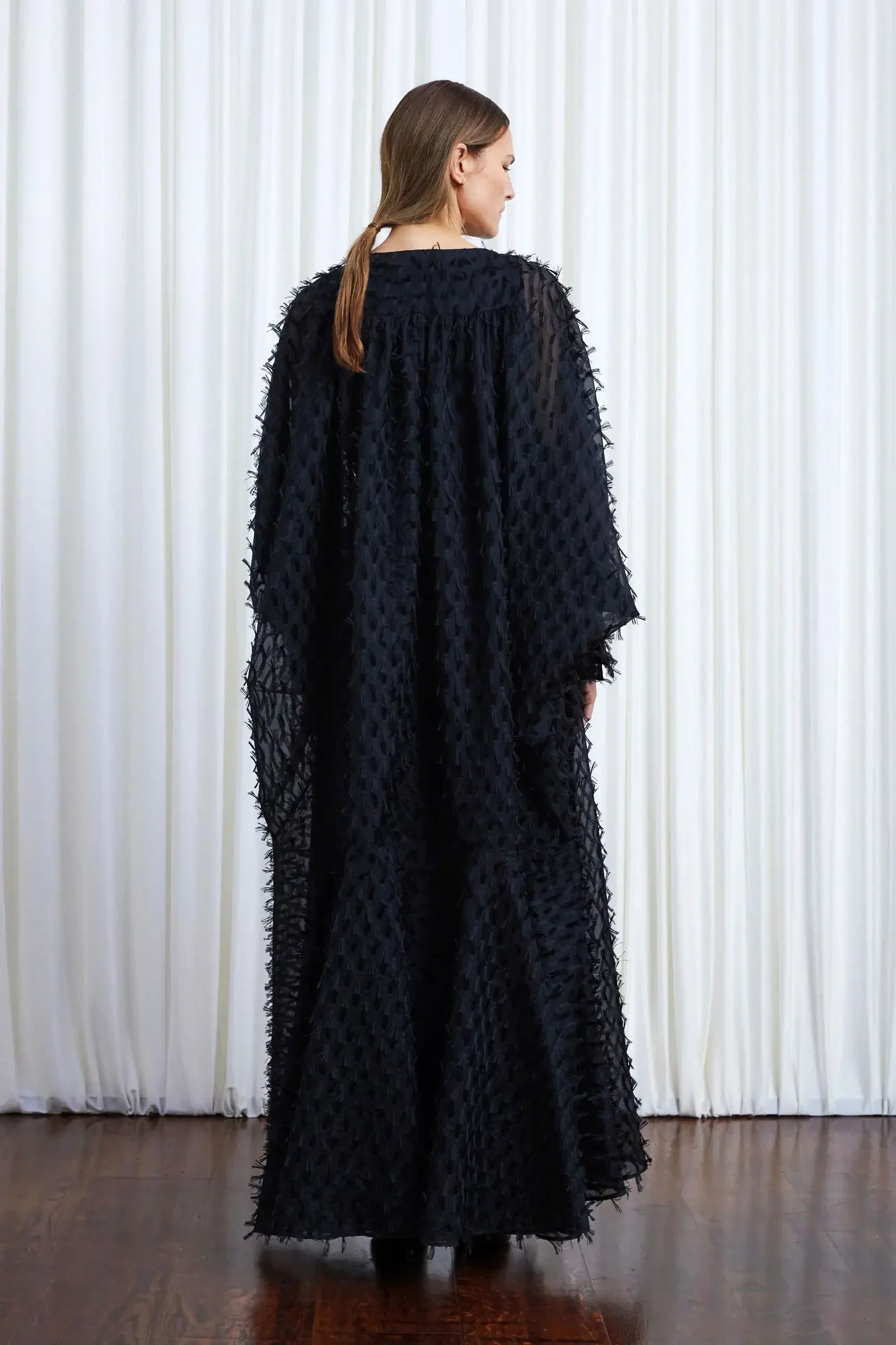 This garment is constructed in an artisanal silk blend organza fil-coupe fabric, providing light weight and transparent layers underneath while offering textural finishes with the flourish of eyelash like fil-coupe on the surface.