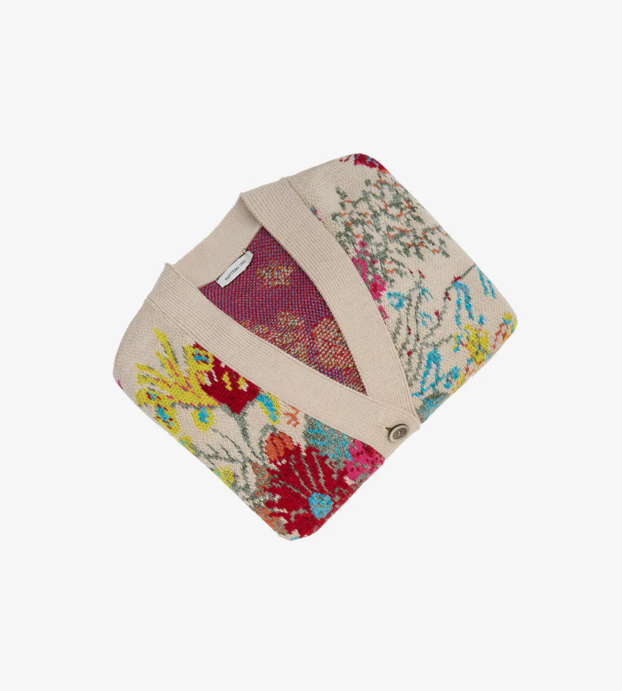 Oversized v-neck cardigan in wool jacquard. Horn-effect buttons. 14-color jacquard floral decoration. Relaxed fit. The model is 176 cm tall and wears a size S. Made in Italy.