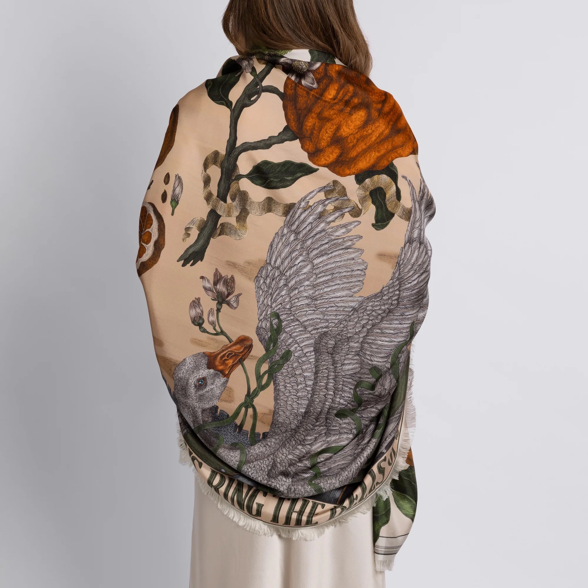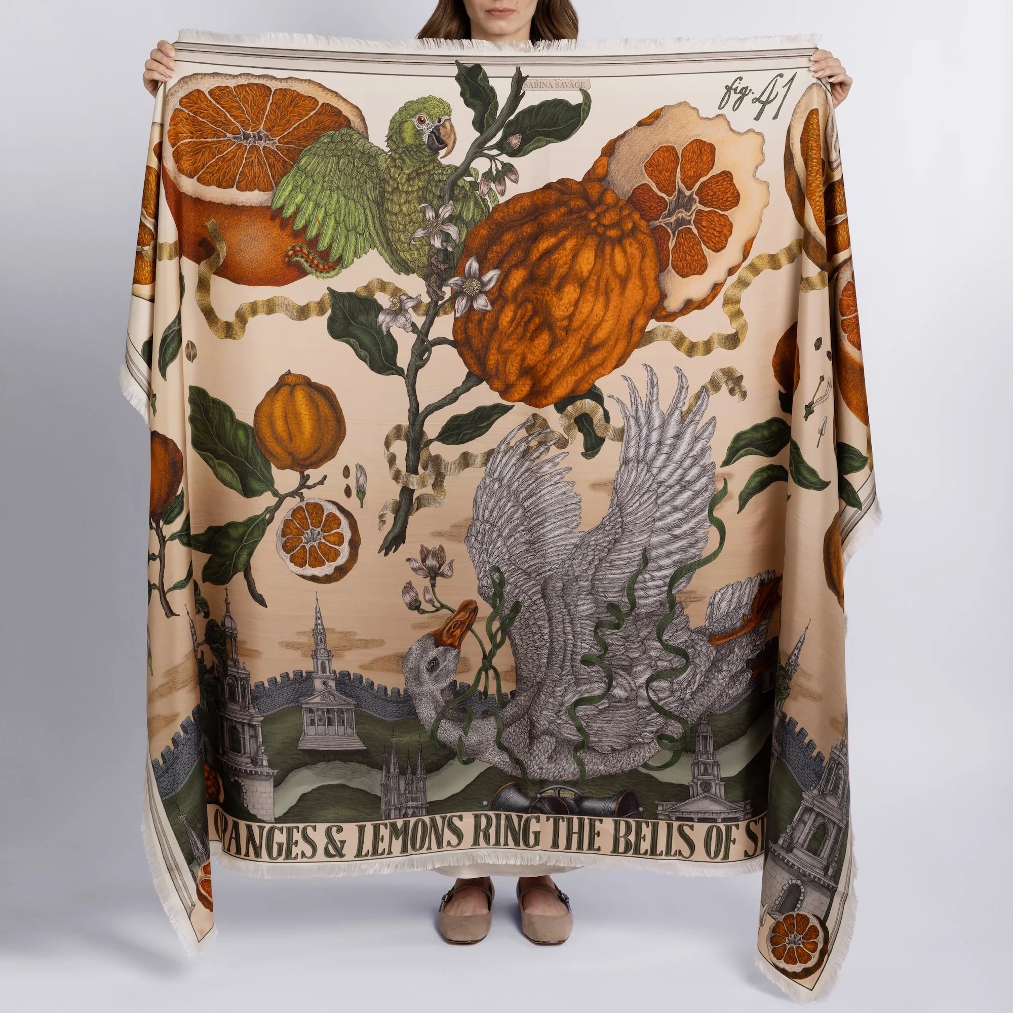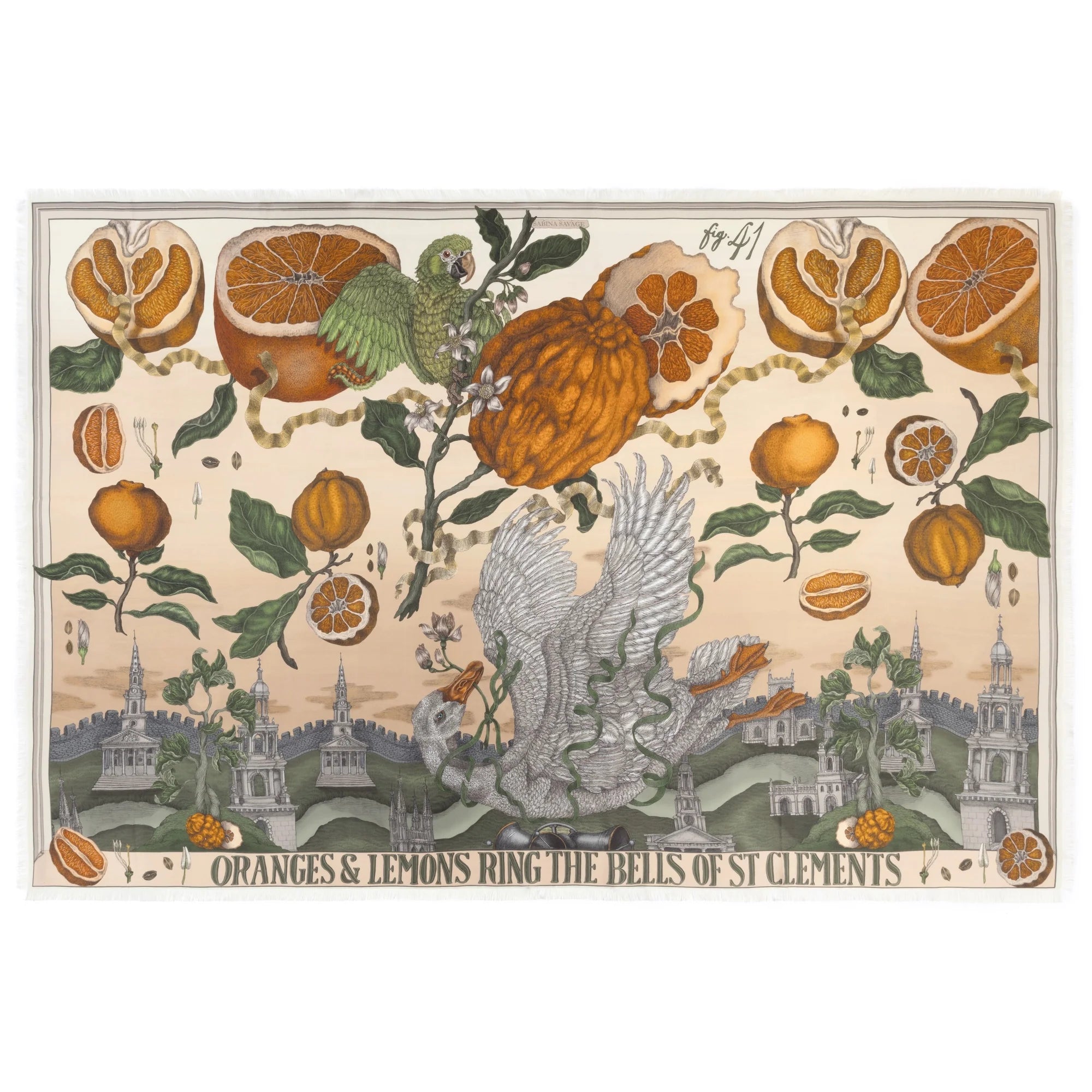 This design is filled with a scene of exotic and explosively vibrant citrus fruits, each contrasting against the neutral, simple background. Amongst the fruits, a striking green parrot looms, heralding the arrival of tropical new species to England, an unknown threat to our domestic breeds of the era.