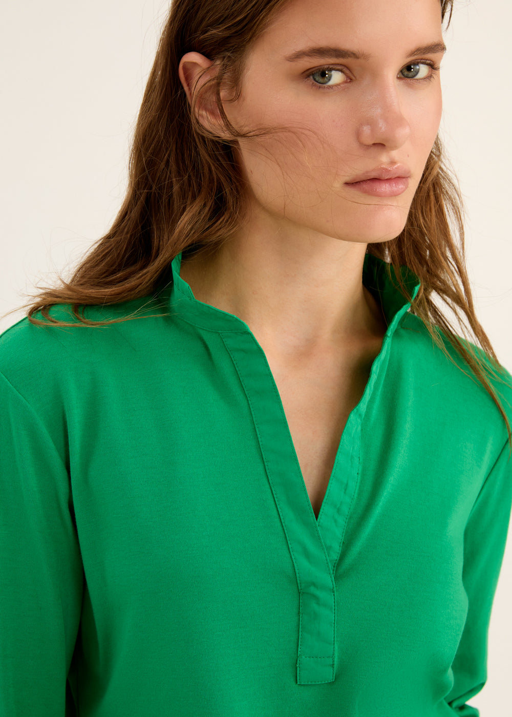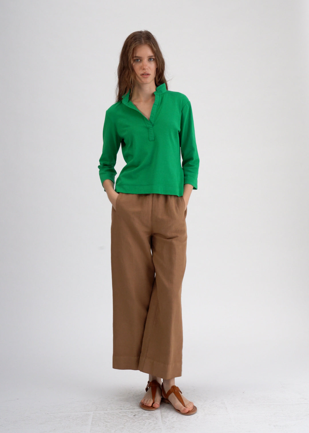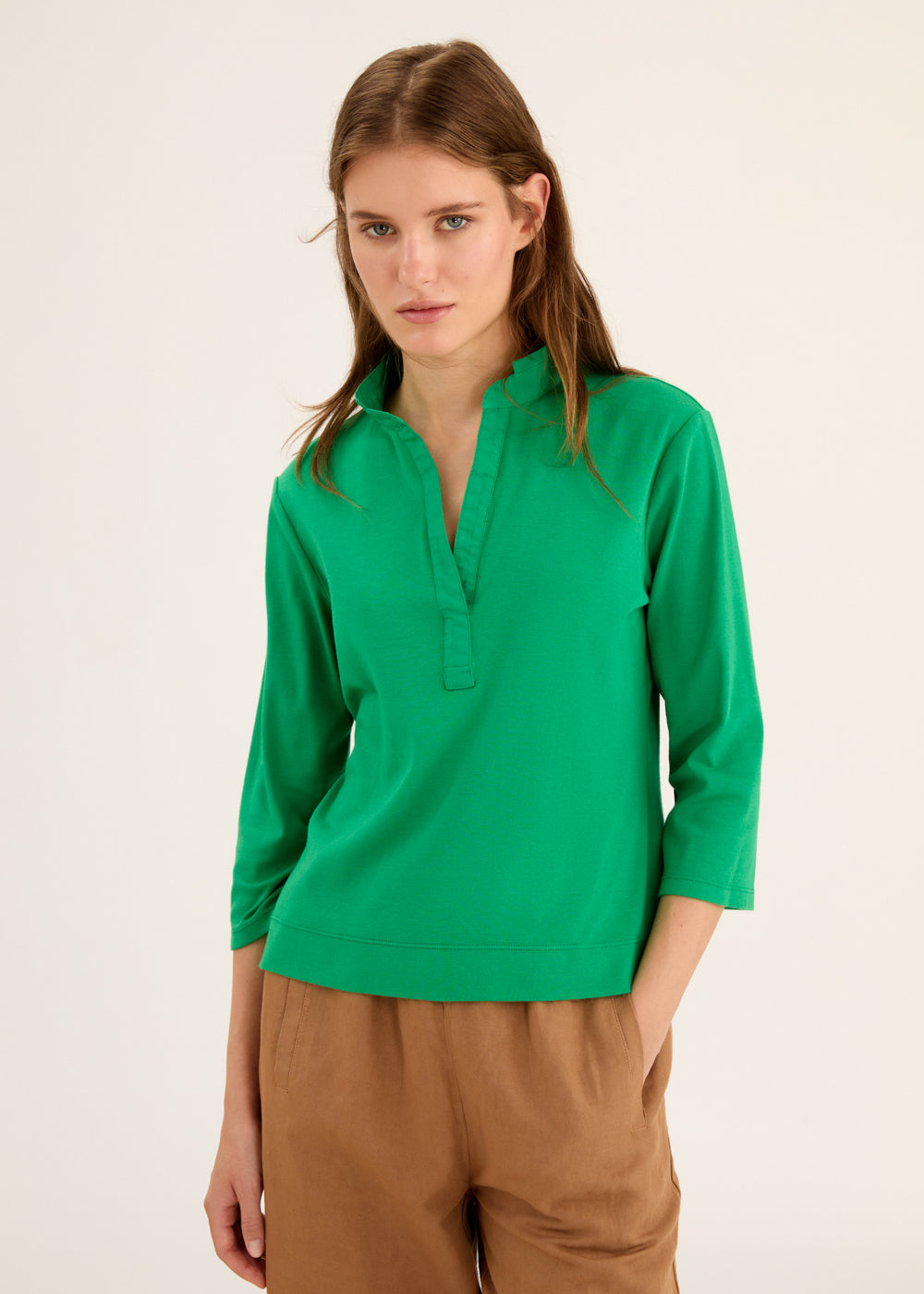 Crafted with lightweight and breathable cotton, this shirt features an open collar neckline design and 3/4 sleeves. Perfect for a casual yet refined look, it offers a comfortable fit and effortless style. Elevate your wardrobe with this versatile and timeless piece